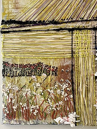 Mixed media: Silk, paper, thread, rattan, acrylic on canvas